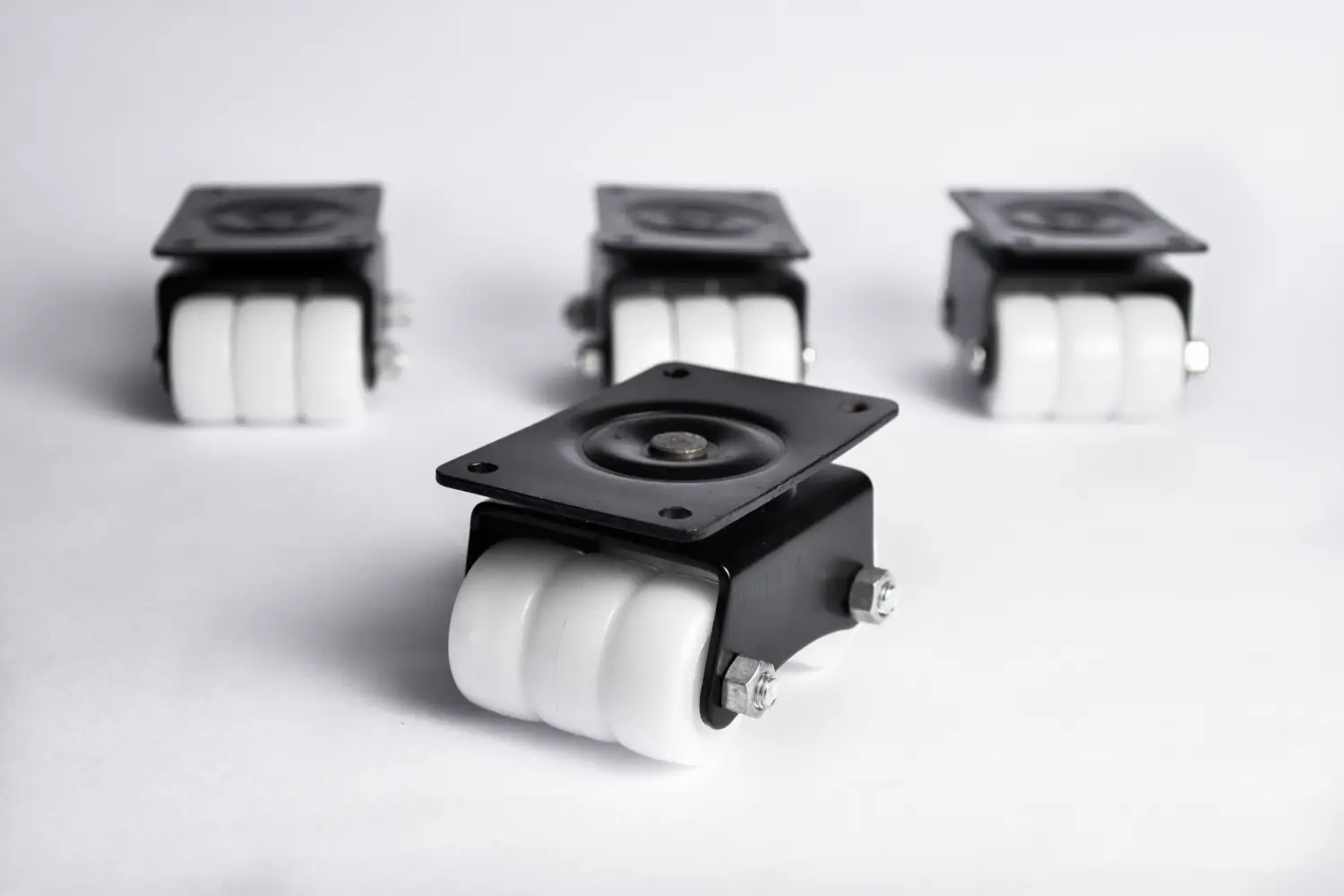 Custom made bolted pins which provide easy replacement of wheels in case the wheel gets jammed due to hairs, dust, thread fibers etc.